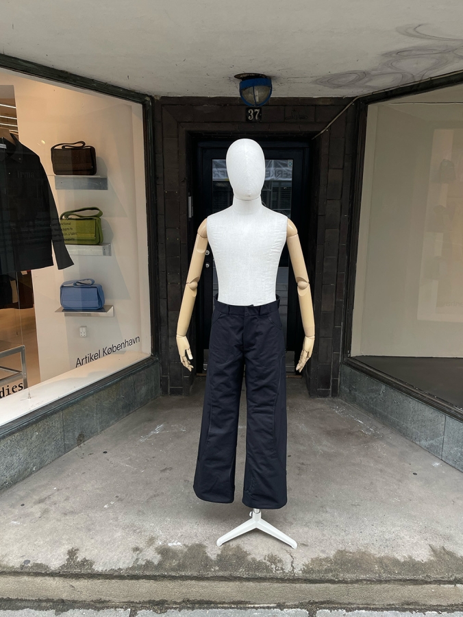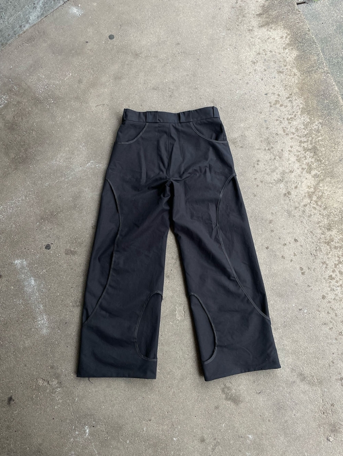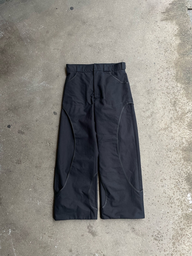 The trousers are constructed with a dual layer that creates room for pockets and no visible end seams, and the outer layer is perforated to ease movement and weight of the garment.