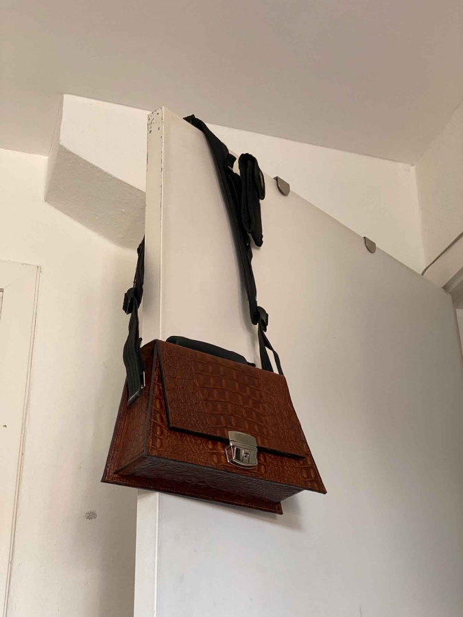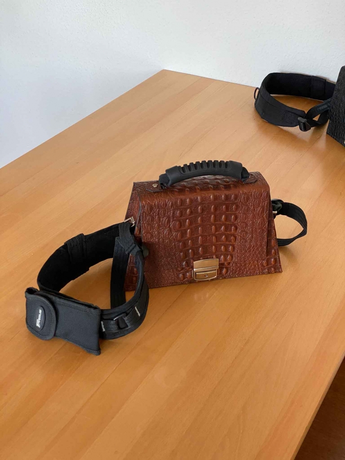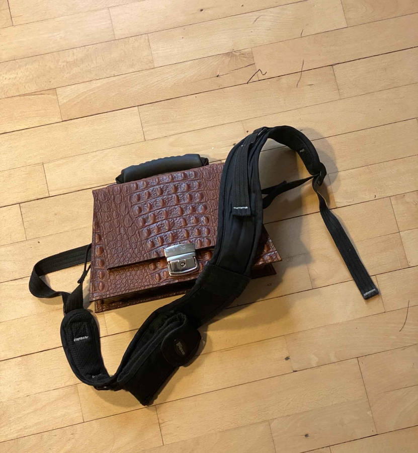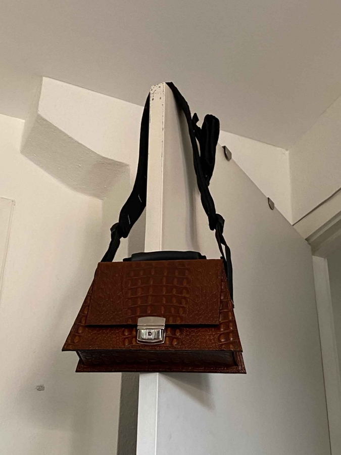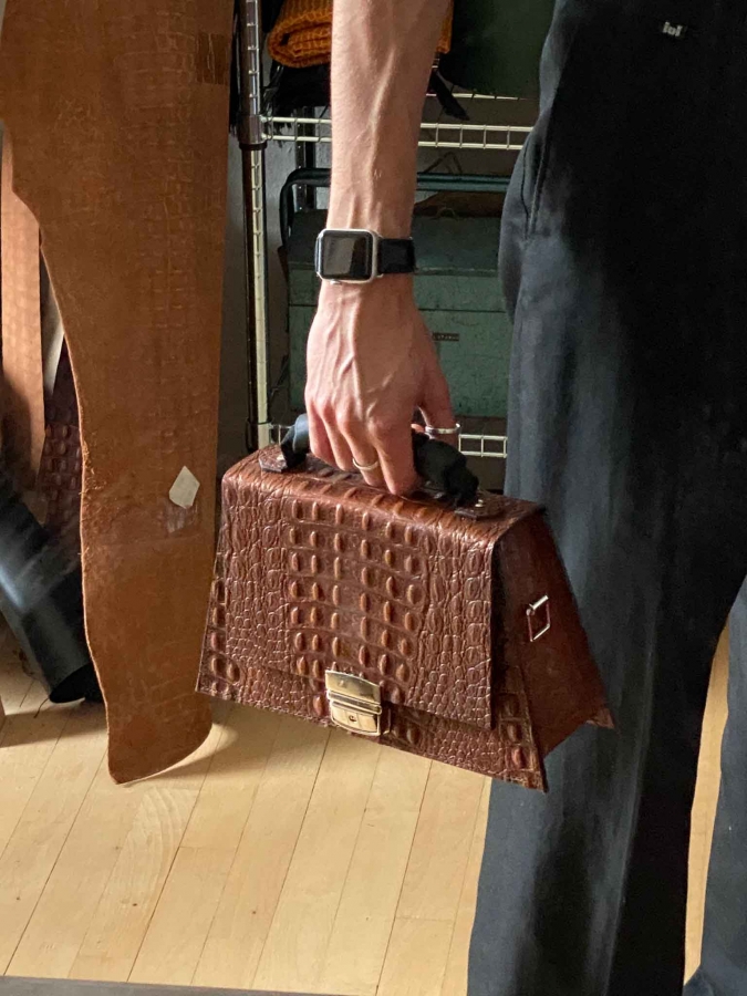 3mm crocodile embossed leather, buckle closure, chrome hardware. Detachable padded strap with utilitarian details for comfort, made from a recycled backpack. Utilitarian rubber top handle.