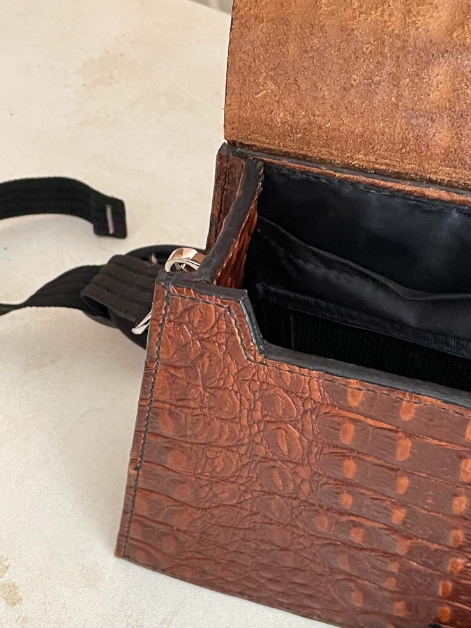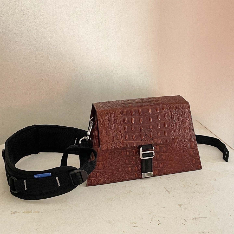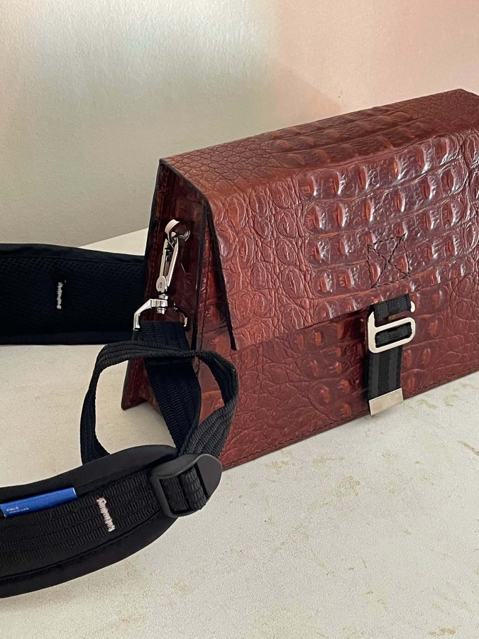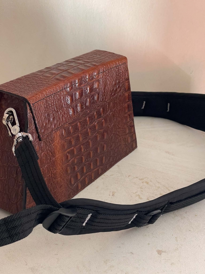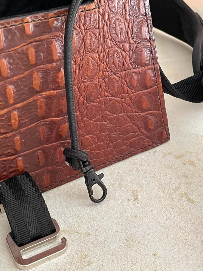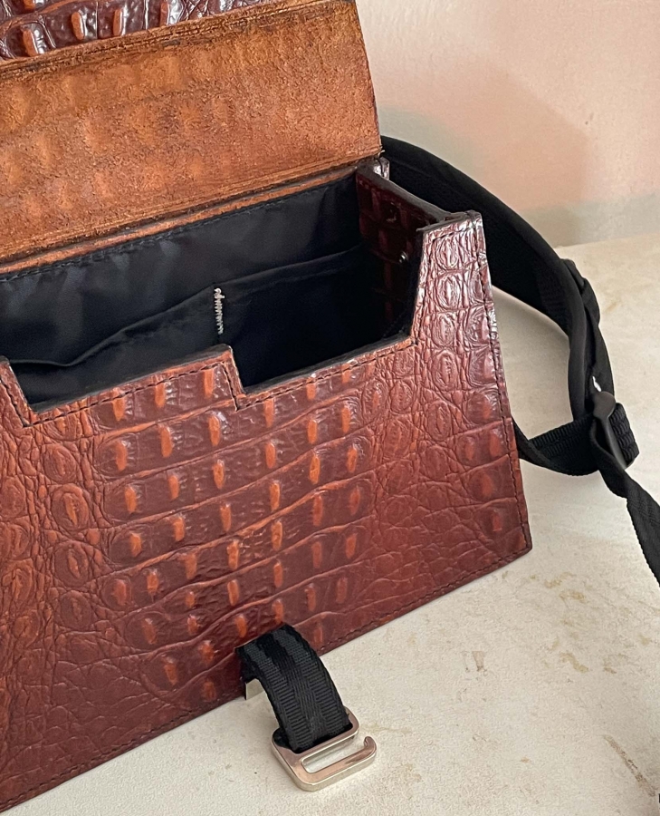 3mm crocodile embossed leather, G-hook closing mechanism, chrome hardware. Detachable padded strap with utilitarian details for comfort, made from a recycled backpack. Inner compartment.
