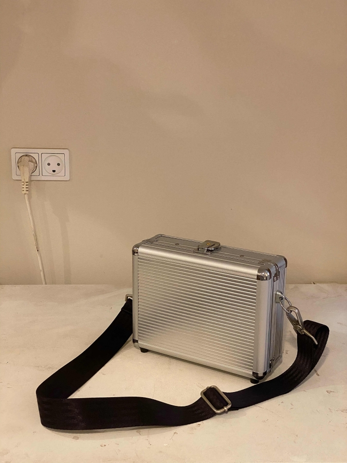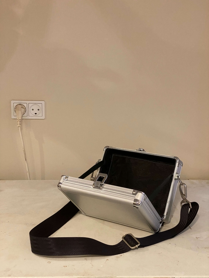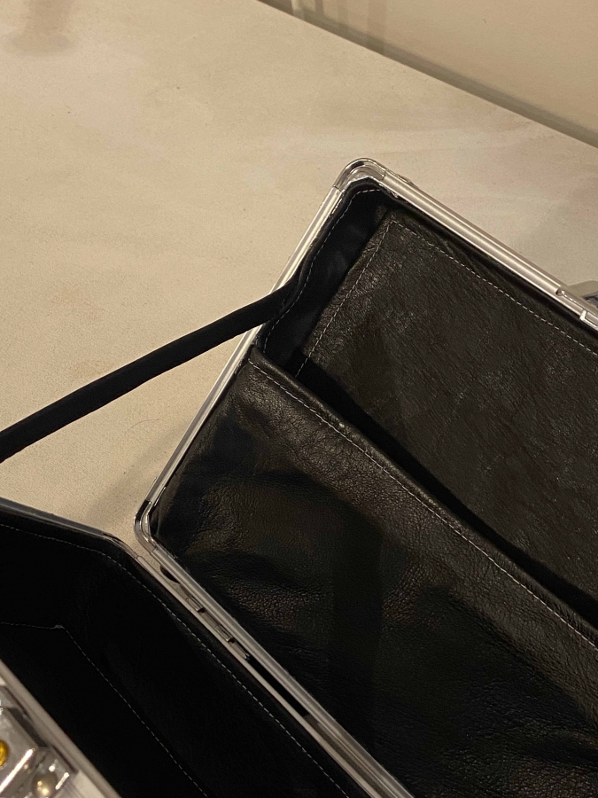 Aluminium casing, reinforced webbing, inside compartment with pocket. Black lamb hide.