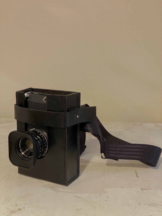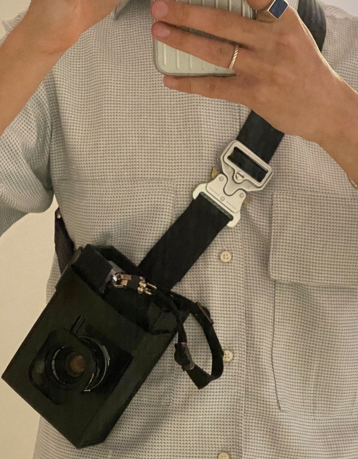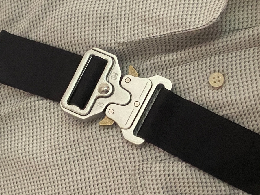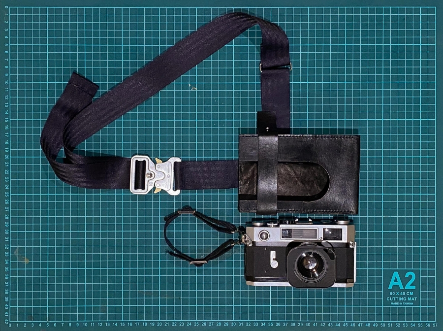 Reinforced nylon webbing, 3mm overdyed italian leather, QR-buckle and knob closure on front