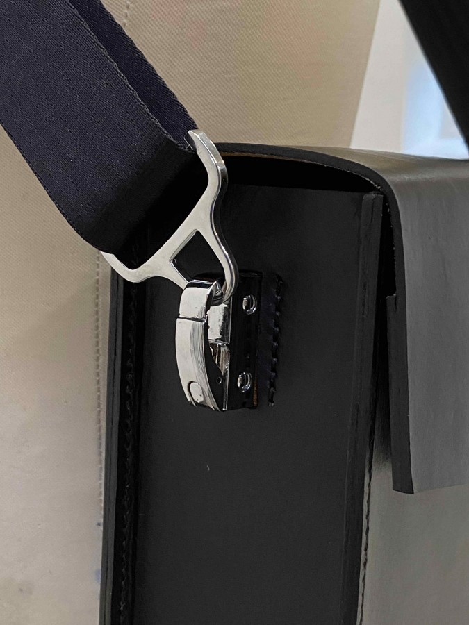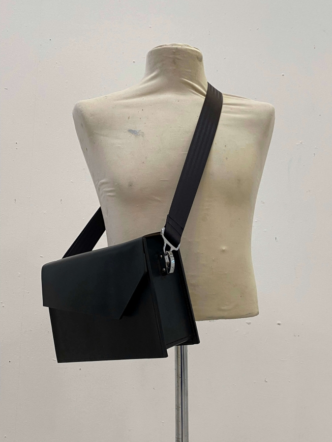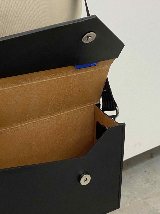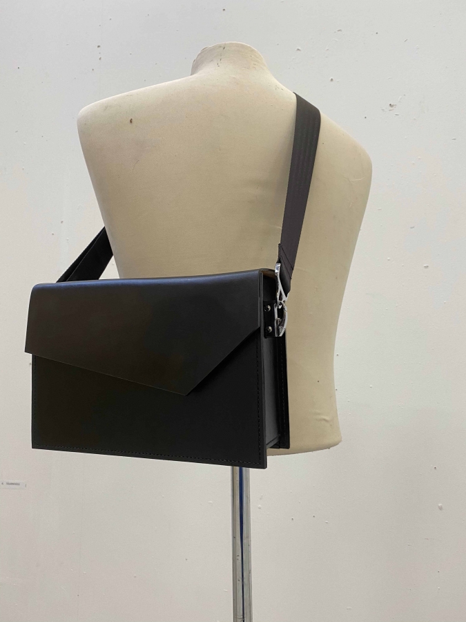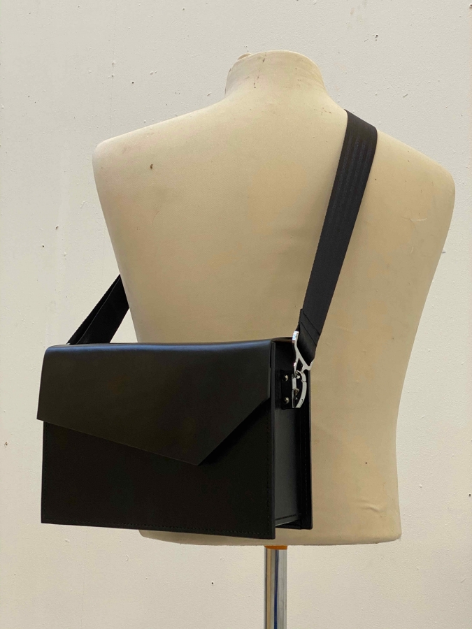 Dyed 3mm veg-tan laser cut Italian leather, asymmetrical front piece, magnetic closure. Detachable nylon webbing strap.