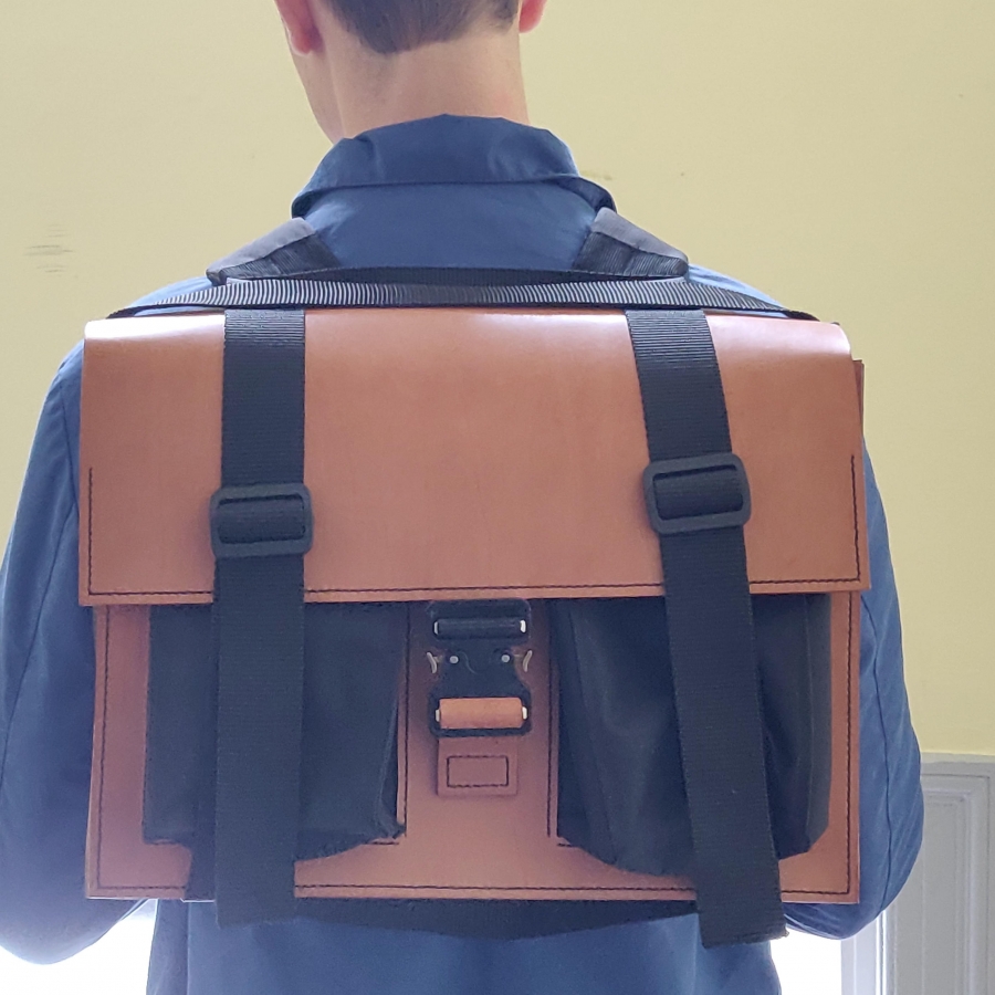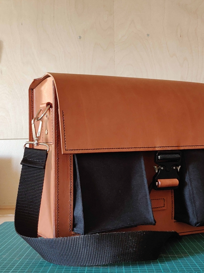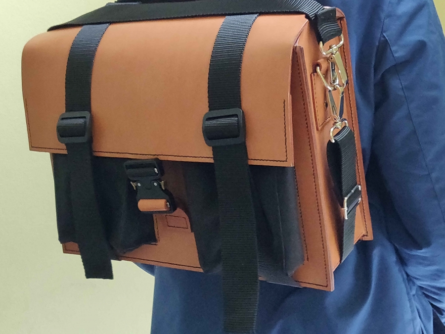 3mm veg-tanned leather, 3 piece molded gusset. W/ quick-release lock mechanism, cordura type nylon pockets, detachable strap.