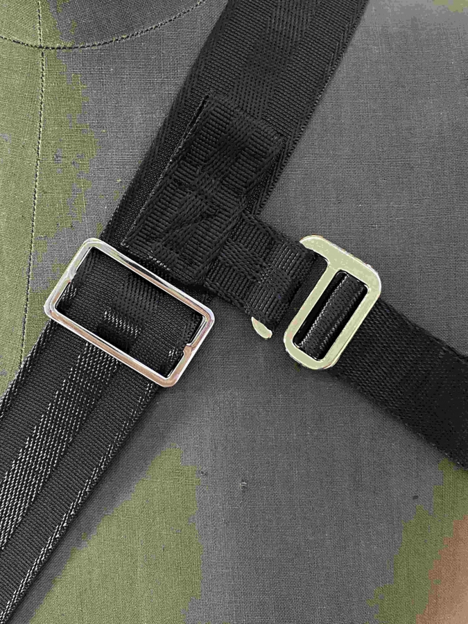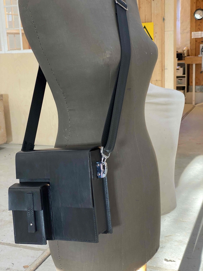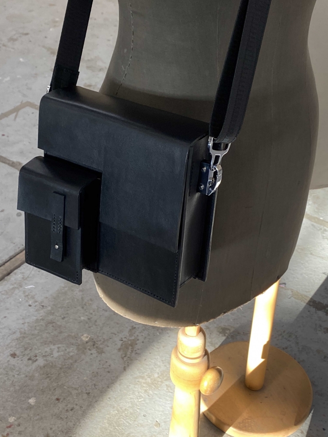 Dyed 3mm veg-tan italian leather, reinforced nylon webbing, chrome hardware, magnetic closure. ʎ-type fastening with g-hook.